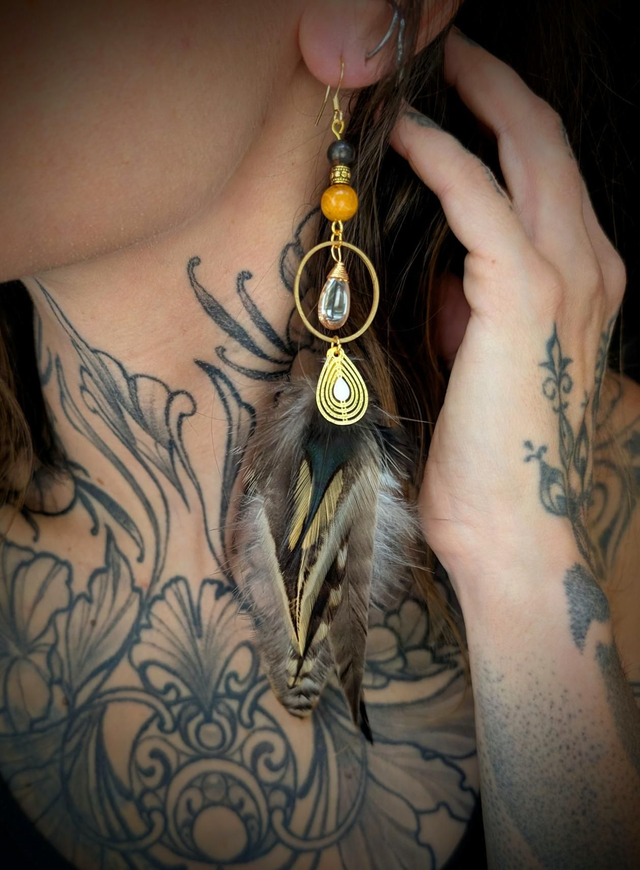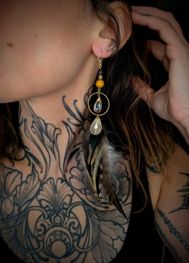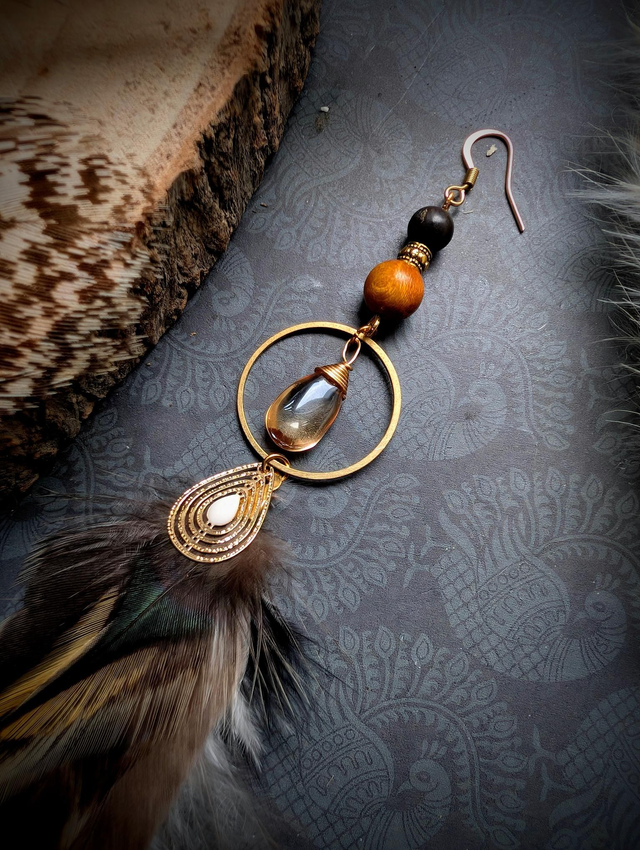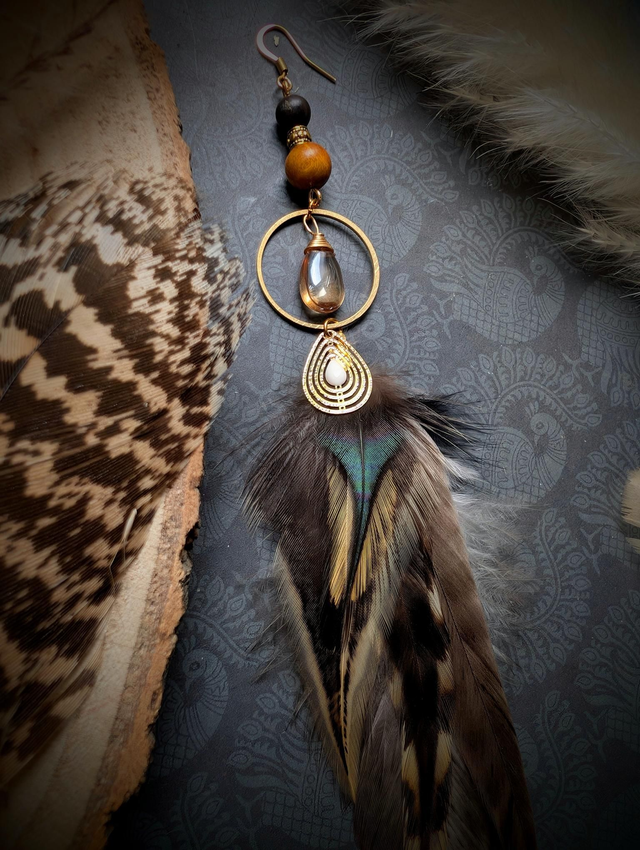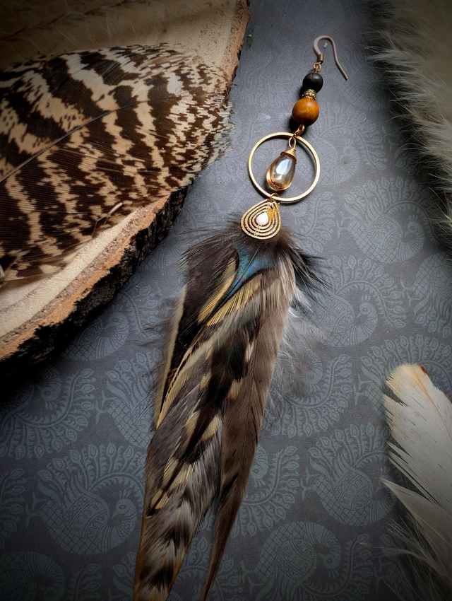Les plumes tachetées aux reflets subtils complètent ce talisman, messager des secrets de la forêt.