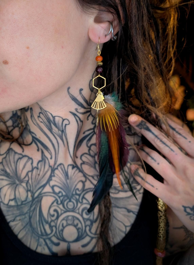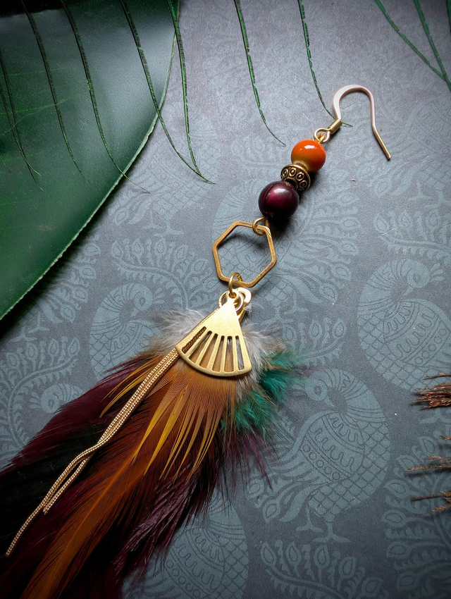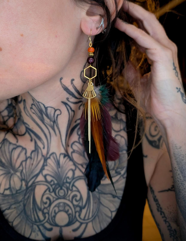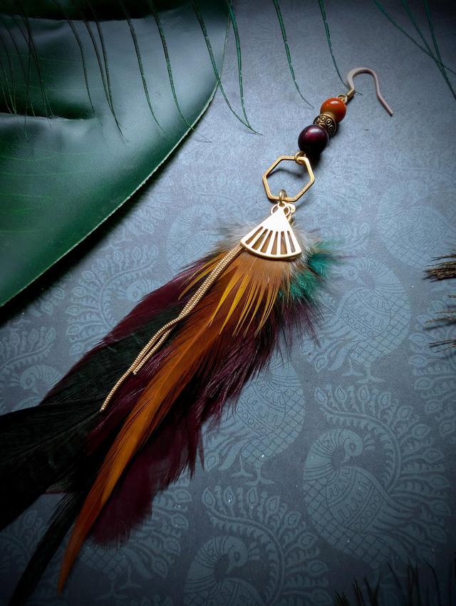 Infusée de lumière et de feu, Solaraé évoque le soleil traversant la jungle à l’aube. Les plumes cuivrées rappellent les rayons filtrés à travers les lianes, et les perles rougeoyantes battent au rythme du tambour tribal.
