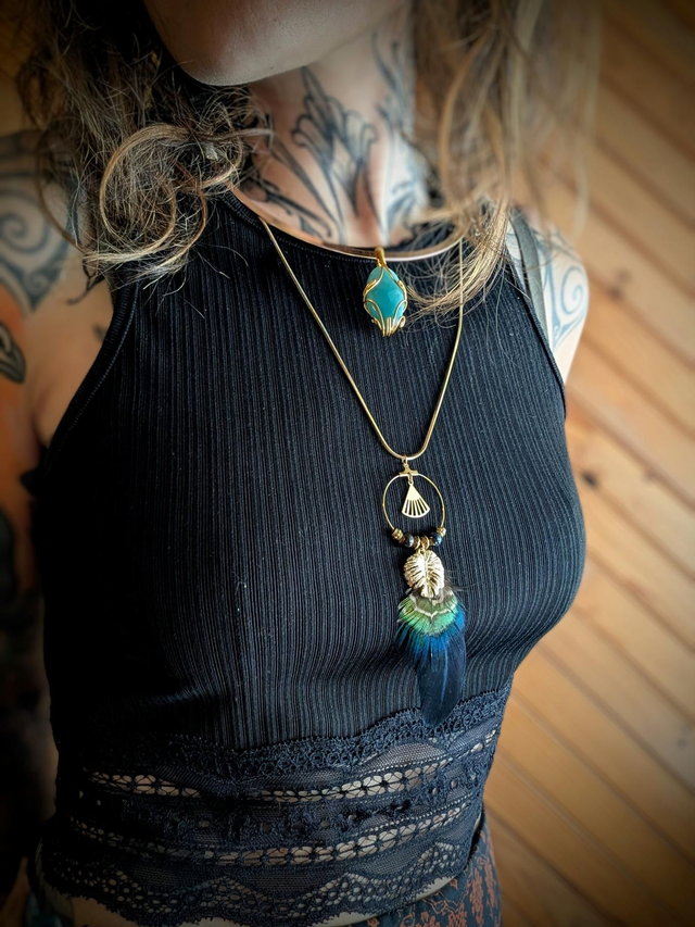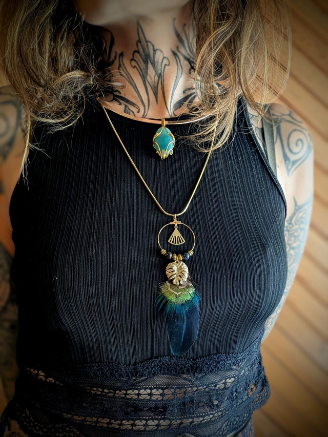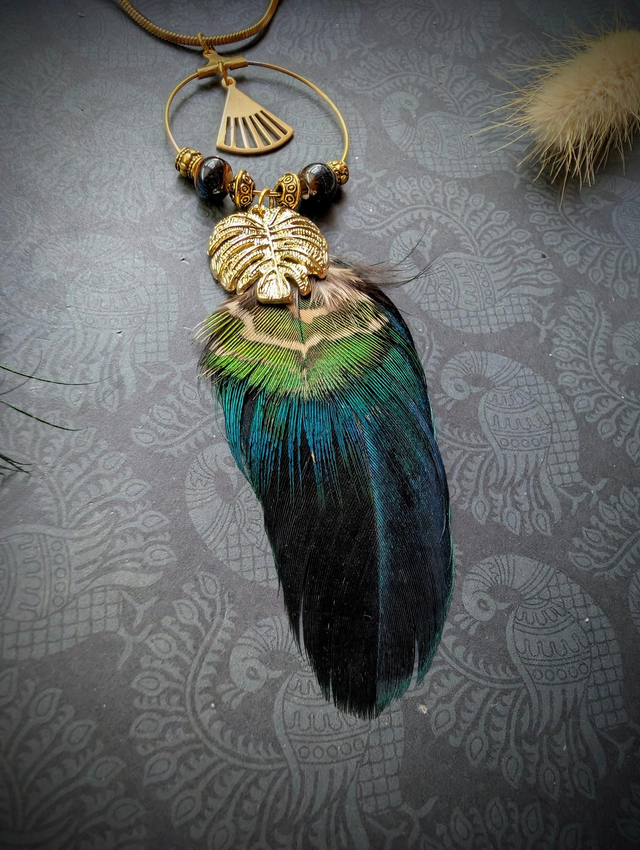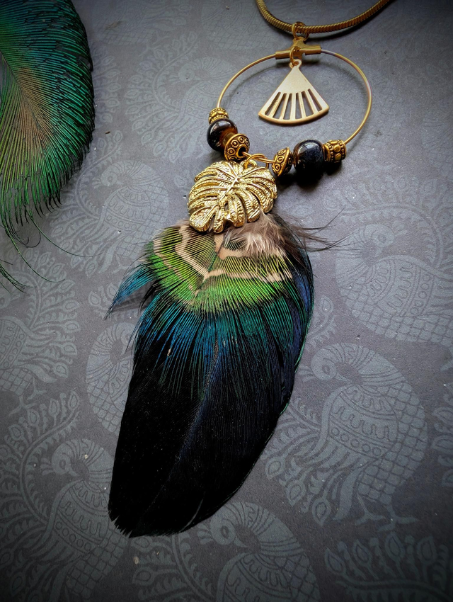 Les plumes de paon vibrantes aux reflets verts et bleu profond ancre l’énergie dans la Terre et la beauté sauvage.