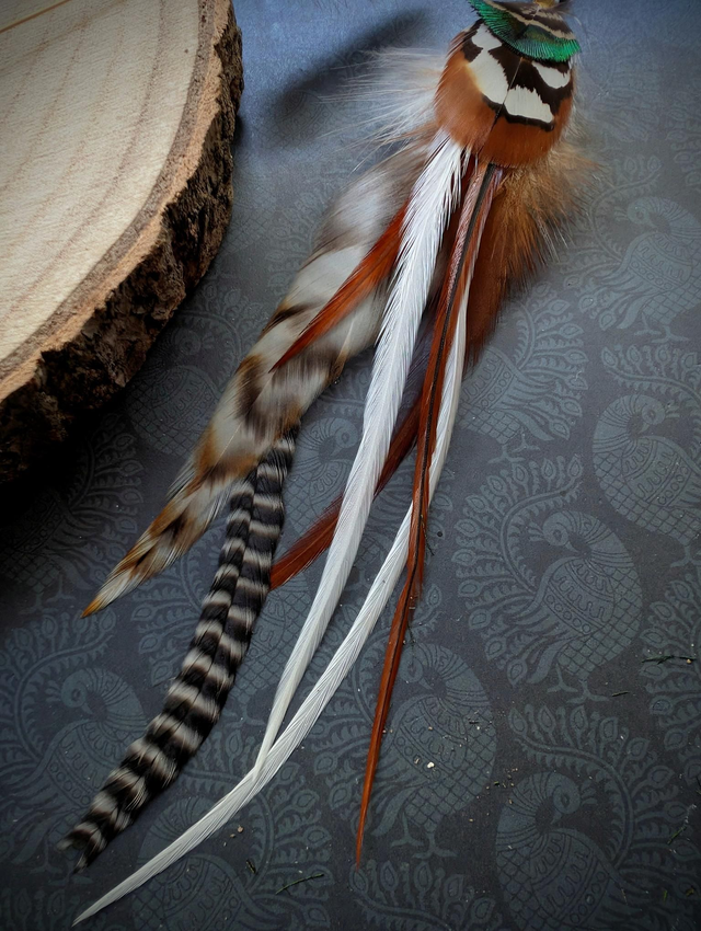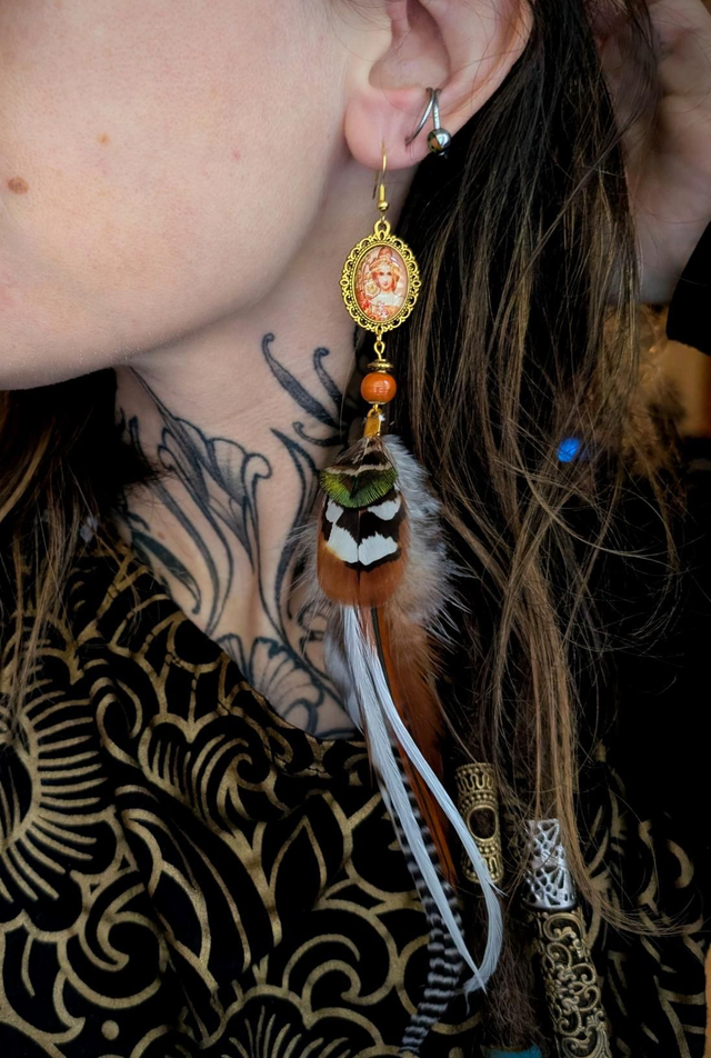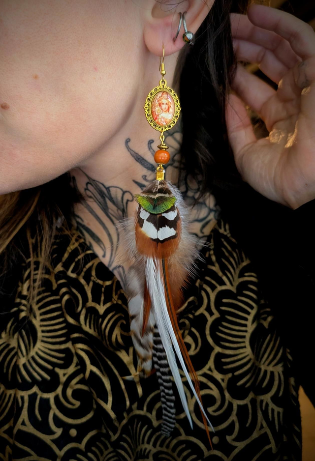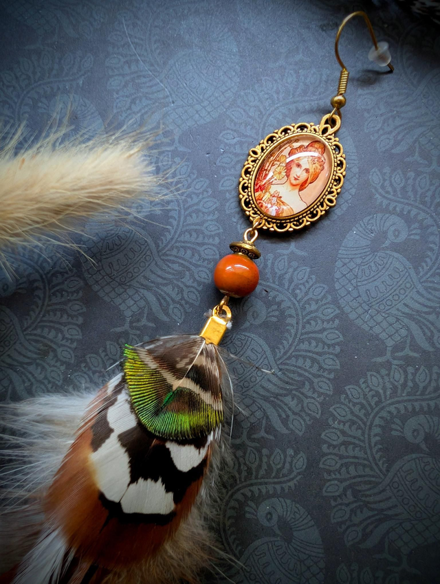 Un bijou qui marie l’élégance de l’Art nouveau à l’énergie sauvage des plumes. Le cabochon doré encadre une tendre scène signée Mucha, sublimée par des perles chaudes orangées. En contraste, les plumes aux reflets roux, blancs et noirs offrent un souffle bohème, léger et vibrant. Une pièce solaire qui incarne la féminité libre et lumineuse.