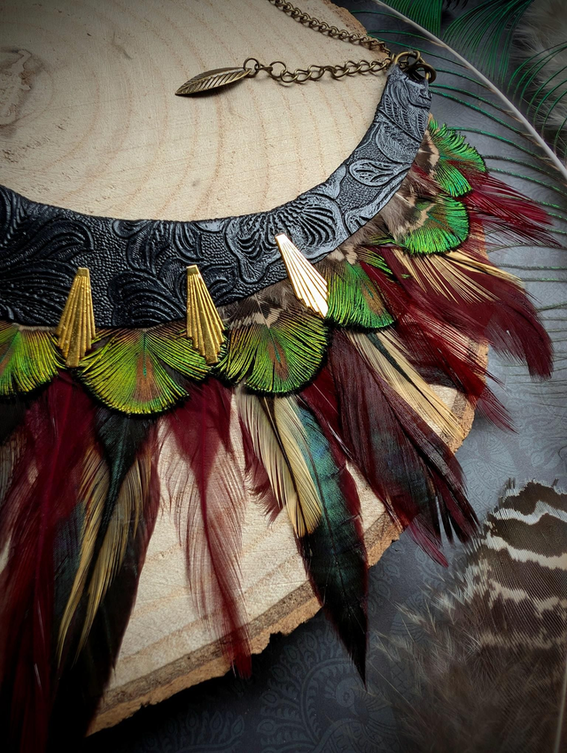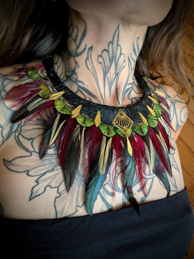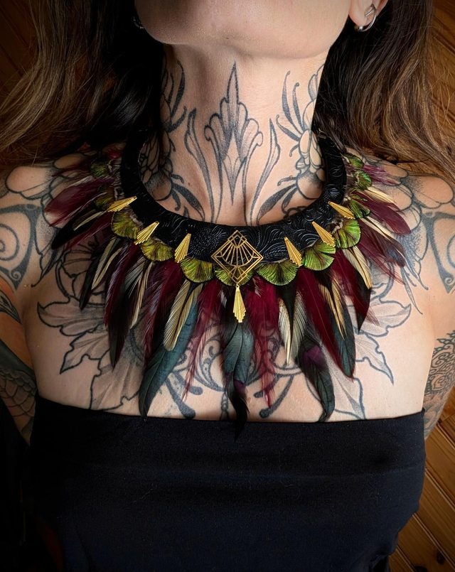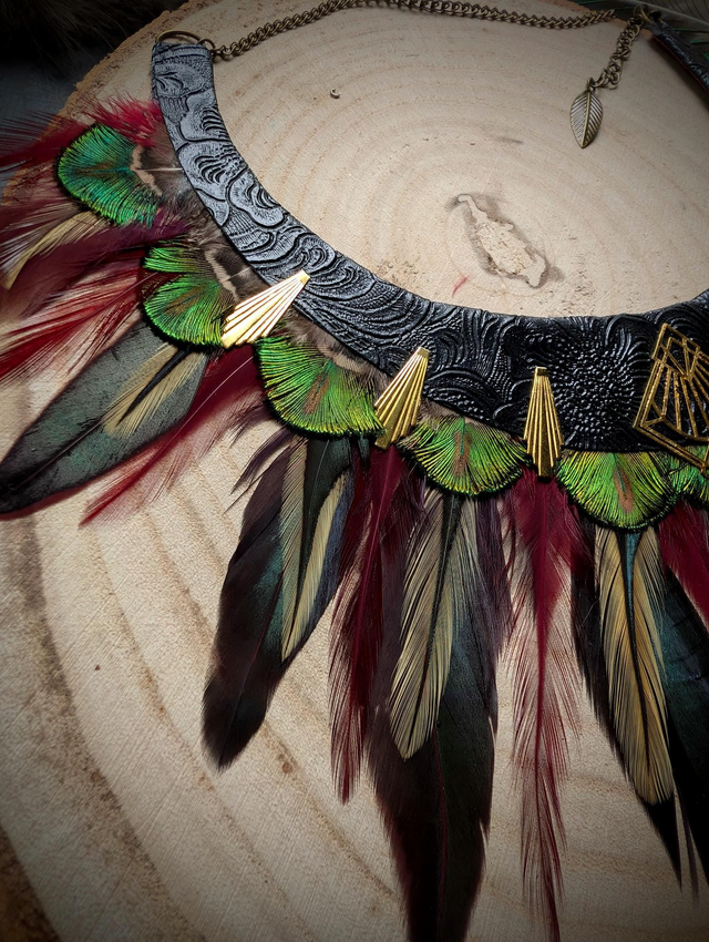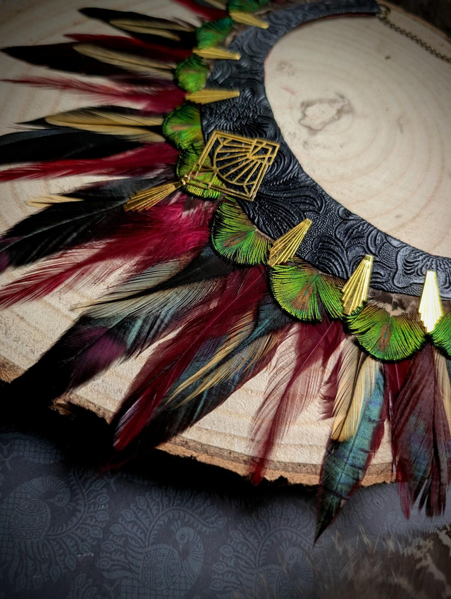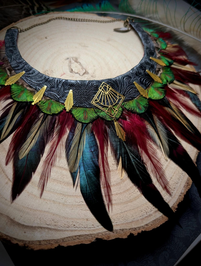 Orné de plumes profondes aux reflets verts, bordeaux et noirs, sublimées par des éclats dorés, ce plastron incarne la puissance des forêts sacrées.