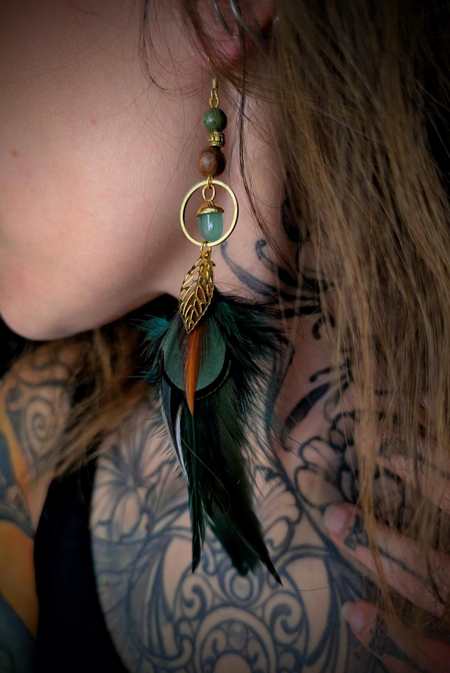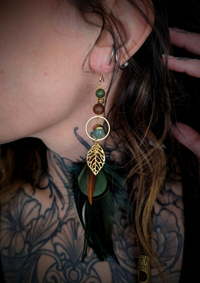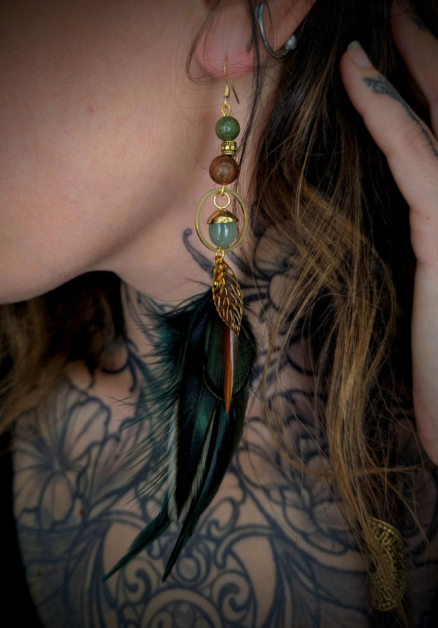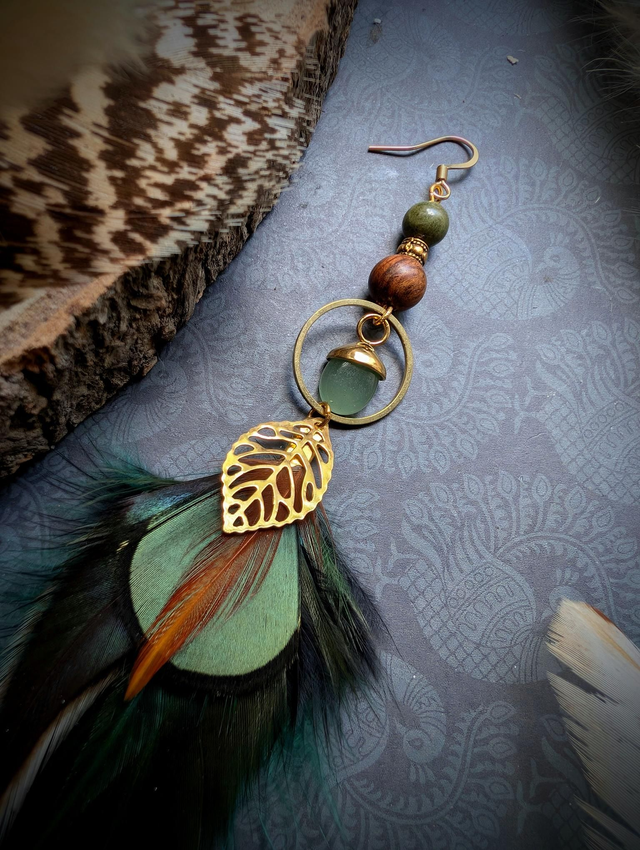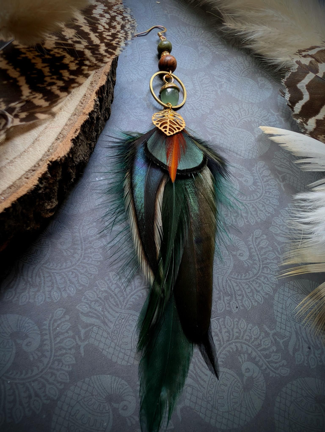 Ses plumes vert profond et ses reflets cuivrés rappellent la force des grands arbres enracinés, tandis que la feuille dorée ajourée incarne la vitalité végétale.