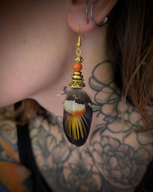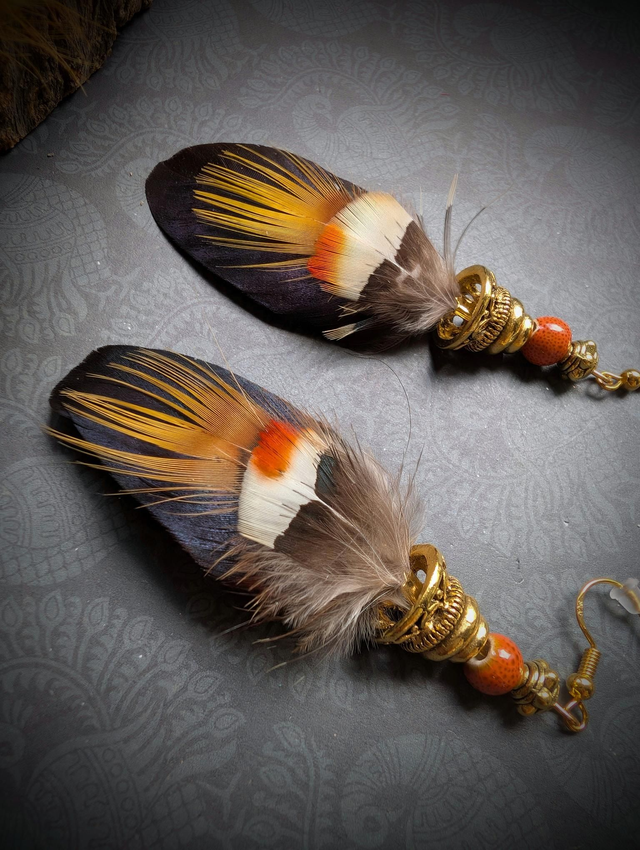Tissées d’harmonie entre les plumes de faisan et de coq aux nuances profondes, elles captent la lumière avec grâce. Chaque détail — de la douceur du duvet à l’intensité des tons cuivrés — évoque la chaleur d’un feu sacré.