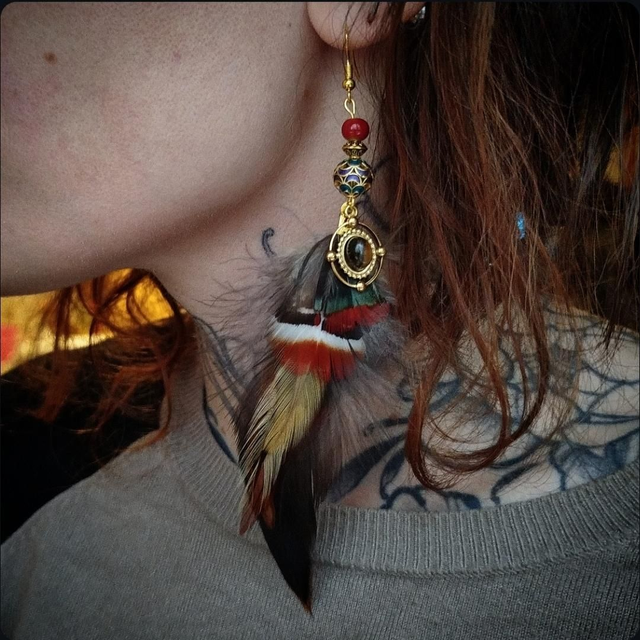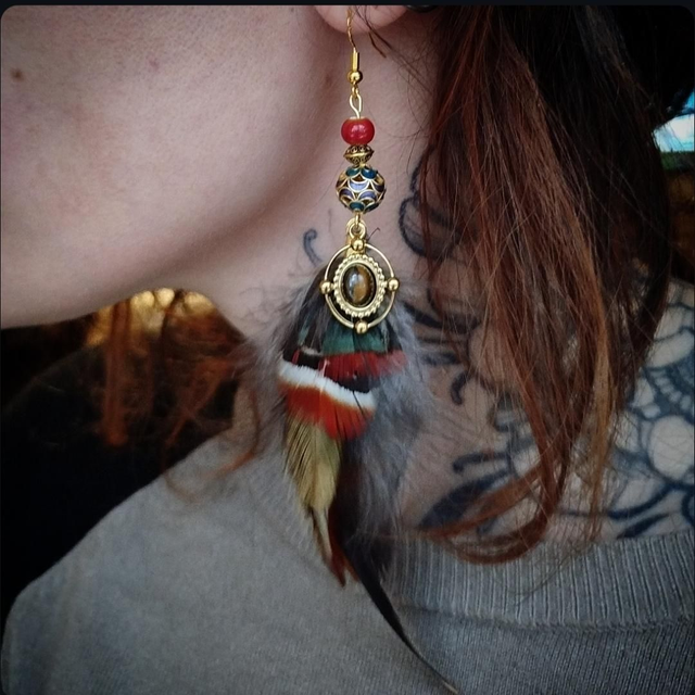 Apportez une touche d’originalité à votre style avec cette boucle d’oreille solitaire, conçue à la main dans un esprit tibetain. Composée de plumes naturelles, elle allie légèreté et élégance pour un rendu à la fois ethnique et raffiné.
