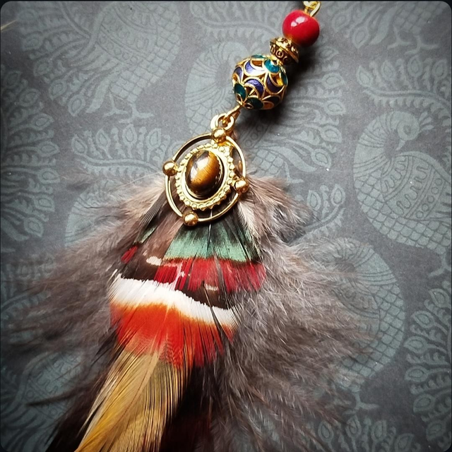 Matériaux : Plumes naturelles, perles, oeil de tigre