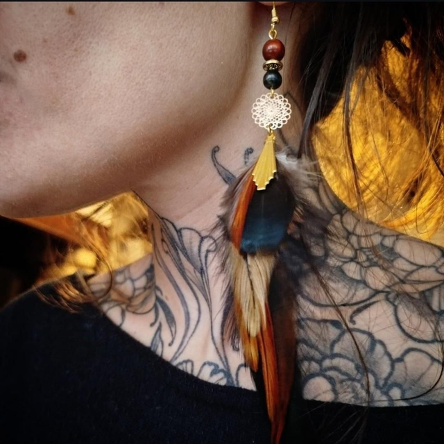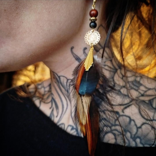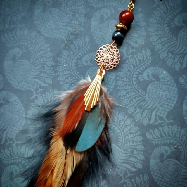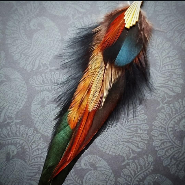 Un bijou solaire, vibrant et audacieux. Les couleurs intenses, la plume centrale flamboyante et les ornements dorés en font une parure de cérémonie. Tzara incarne la puissance du feu intérieur, celui des femmes-oracles et des danses rituelles.
