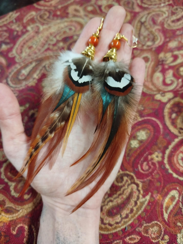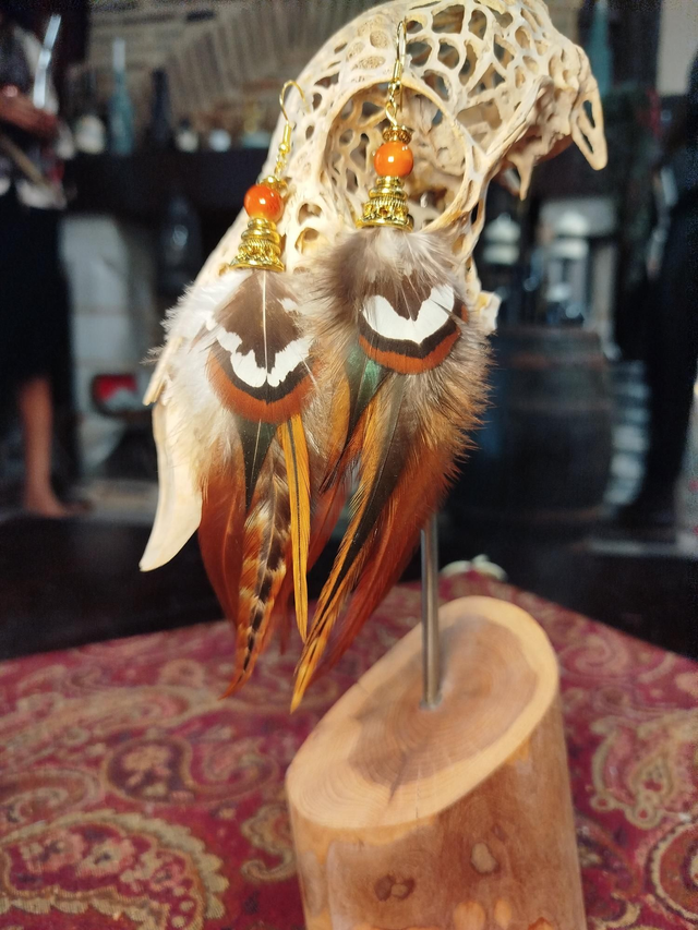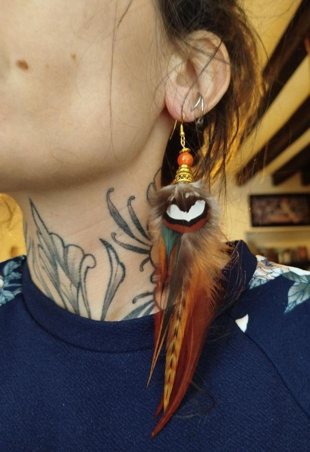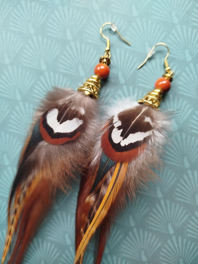 Boucles d'oreilles composées de plumes de coq et faisan avec d'incroyables reflets quand la lumière frappe dessus. Elles sont agrémentées d'une breloque ethnique et d'une perle en céramique.